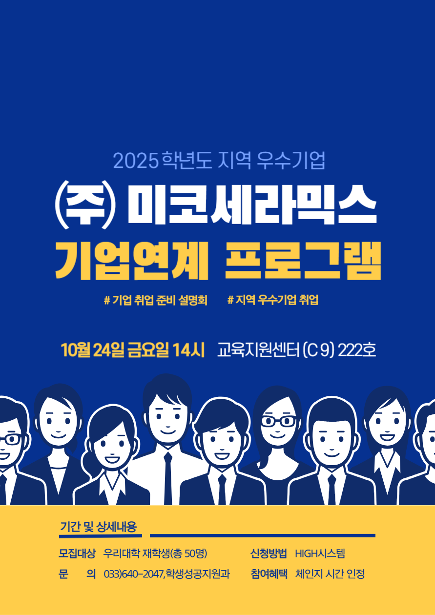 10/24(금) 우리 대학 재학생들을 대상으로 ㈜미코세라믹스 기업설명회를 진행할 예정입니다. 미코세라믹스는 지역 유망기업으로 많은 신청바랍니다.
