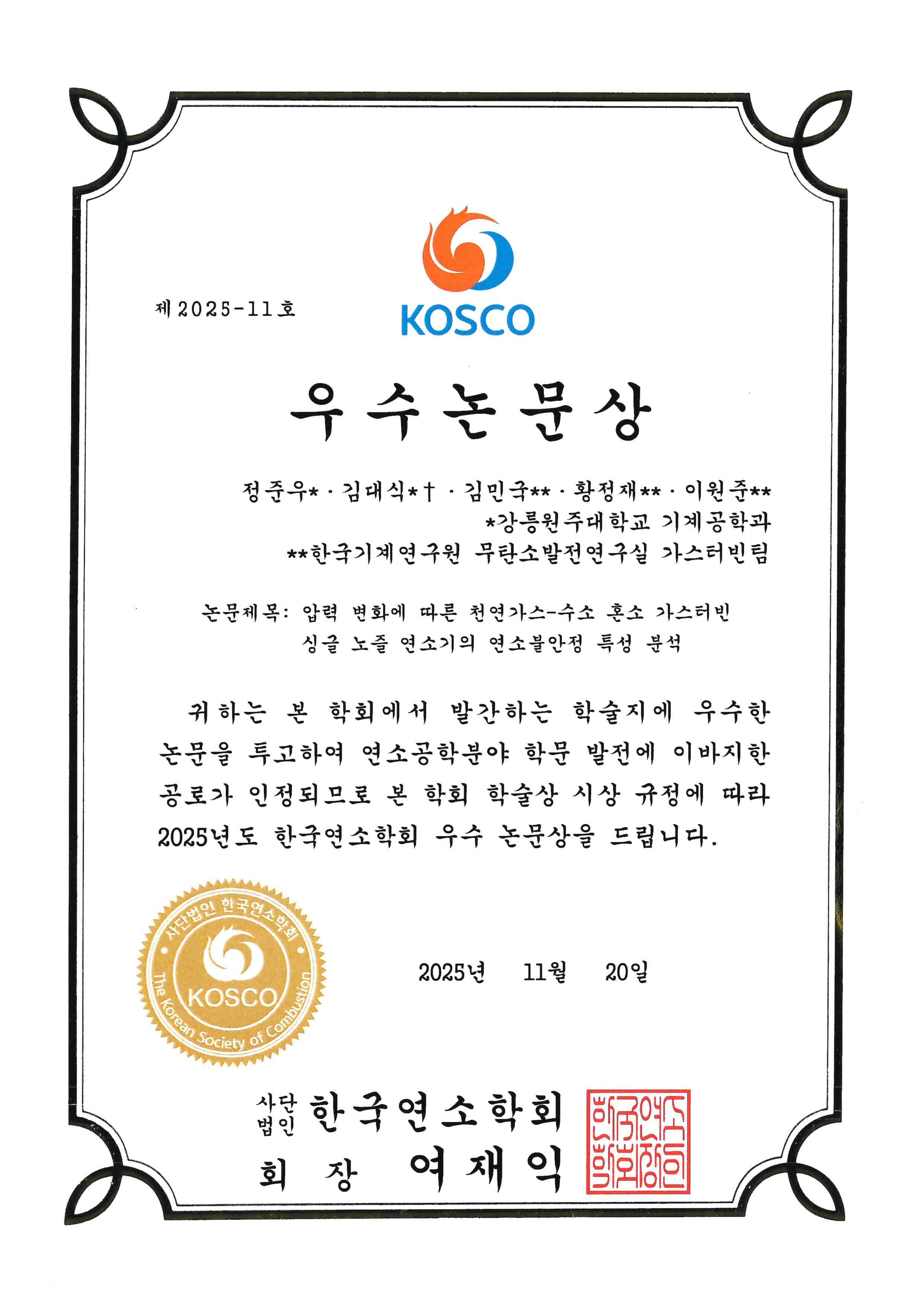 국립강릉원주대학교 기계공학과 정준우(박사과정, 지도교수 김대식) 학생이 지난 11월 20일 (사)한국연소학회(KOSCO)로부터 ‘2025년도 한국연소학회 우수논문상’을 수상했다.