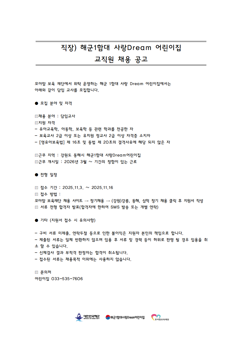 fnctId=bbs,fnctNo=208 해군1함대 사랑Dream 어린이집 교직원 채용 작성일 2025.11.10 작성자 신시원 조회수 1472 첨부파일 첨부파일이(가) 없습니다. 다음글 강릉원주대학교 해람어린이집 보육교직원 모집 공고 신시원 2025-11-17 14:27:43.0 이전글 2025학년도 봉대초등학교병설유치원 하계 방학 중 방과후과정 인력 채용 공고 신시원 2025-06-20 09:24:39.0 총 17 개의 게시물이 있습니다. 게시물 검색 제목 작성자 게시글 리스트 취업정보 번호 제목 작성자 작성일 댓글 조회수 첨부파일 17 한라소담 어린이집 정교사 모집 공고 신시원 2026.03.09 0 718 0 16 강원특별자치도자연학습원 직원 공개 채용 신시원 2026.01.12 0 1260 1 15 강릉원주대학교 해람어린이집 보육교직원 모집 공고 신시원 2025.11.17 0 1748 1 14 해군1함대 사랑Dream 어린이집 교직원 채용 신시원 2025.11.10 0 1472 0 13 2025학년도 봉대초등학교병설유치원 하계 방학 중 방과후과정 인력 채용 공고 신시원 2025.06.20 0 2818 0 12 하이원 정선 어린이집(강원랜드 직장어린이집(한솔보육재단)) 보육교사 채용 공고 신시원 2024.07.17 0 6470 0 11 <원주소방서어린이집 담임교사 구인> 신시원 2024.03.11 0 6426 0 10 근로복지공단 동해어린이집 보육교직원 채용 공고 신시원 2023.11.24 0 4632 0 9 푸른자연 유치원 교사 구인 안내 신시원 2023.08.14 0 2302 0 8 2023년 강릉원주대학교 해람어린이집 교사 채용공고 신시원 2022.12.14 0 2761 2 처음 12 1 2 다음 페이지 끝