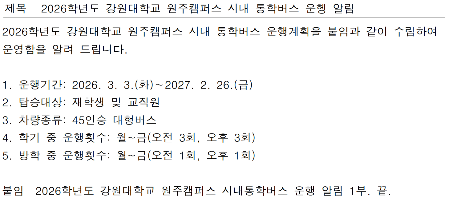 fnctId=bbs,fnctNo=877 2026학년도 강원대학교 원주캠퍼스 시내 통학버스 운행 알림 작성일 2026.03.04 작성자 정하나 조회수 629 첨부파일 ★(알림) 2026학년도 시내통학 운행알림2026. 3.-5-1.hwp