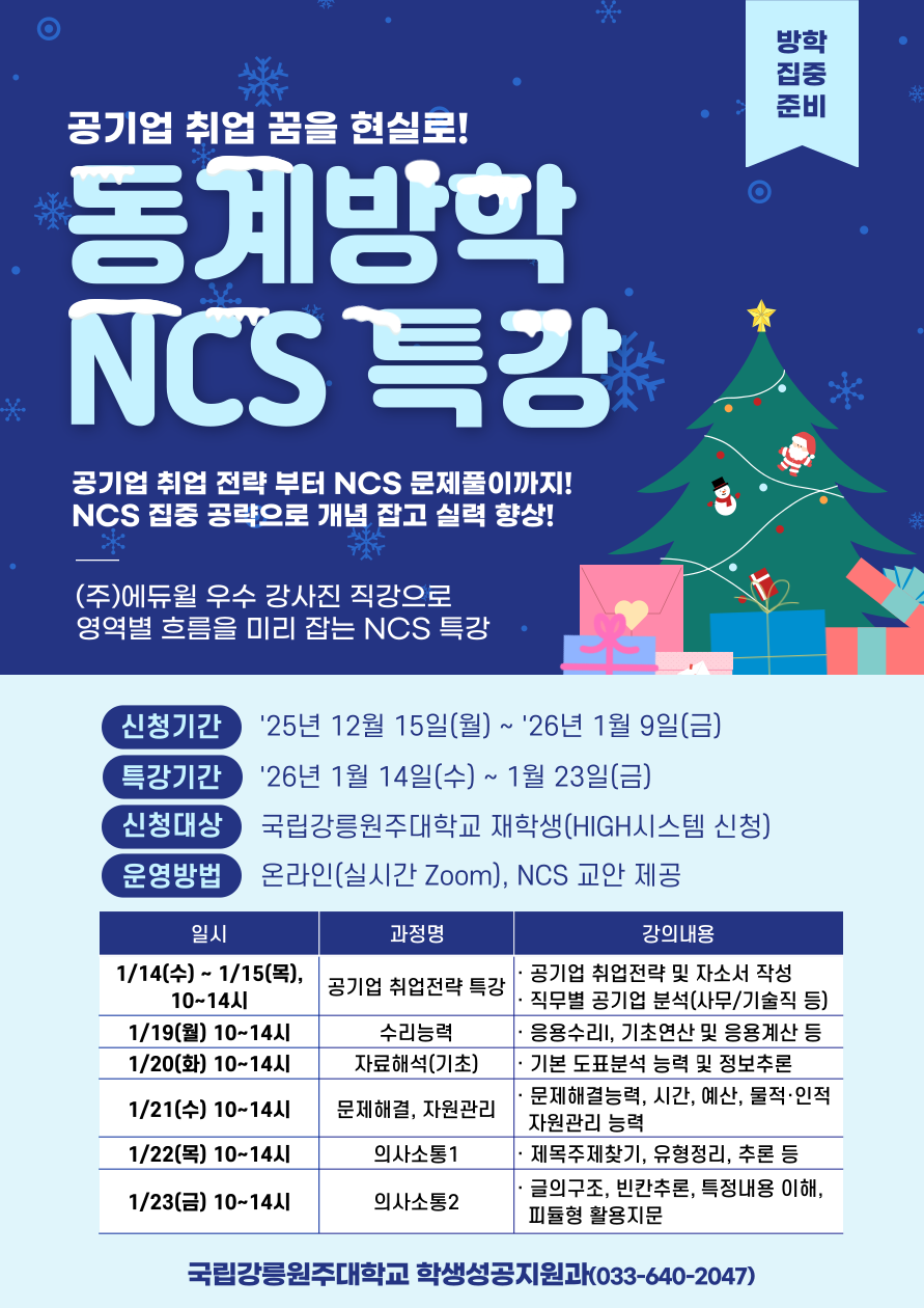 fnctId=bbs,fnctNo=871 [학생성공지원과] 동계방학 공기업 NCS 직업기초능력 향상 프로그램 작성일 2025.12.15 작성자 최지은 조회수 884 첨부파일 첨부파일이(가) 없습니다.
