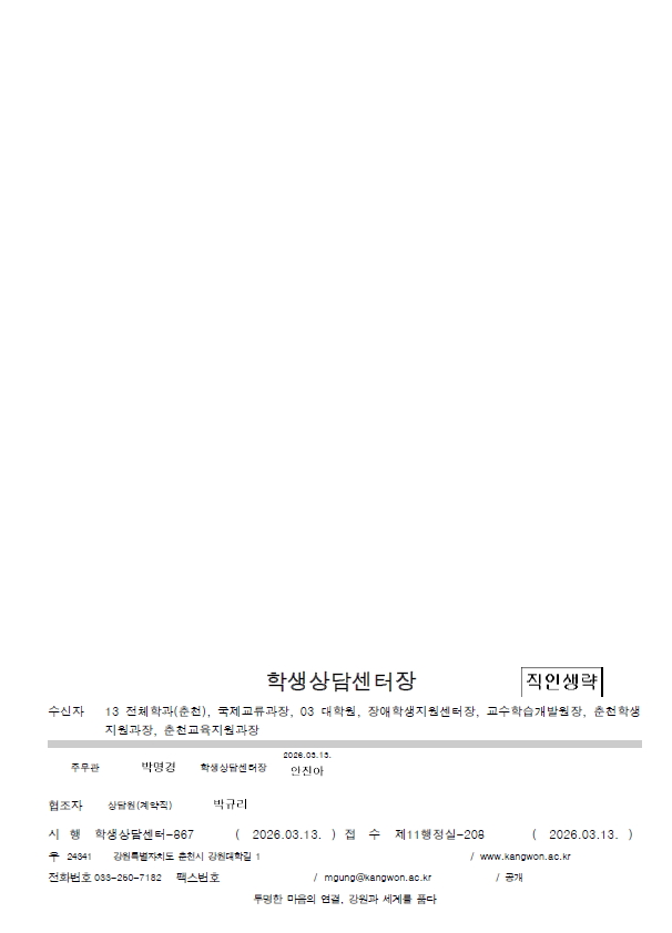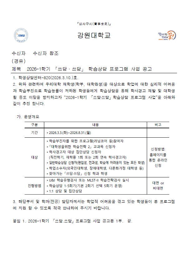 fnctId=bbs,fnctNo=840 2026-1학기 「쓰담·쓰담」 학습상담 프로그램 안내 작성일 2026.03.17 작성자 원민정 조회수 287 2026-1학기 「쓰담·쓰담」 학습상담 프로그램 안내 기간 : 2026.3.3.(화)~2026.8.31.(월) 첨부파일 1.[공고문] 2026-1학기 '쓰담.쓰담' 프로그램 사업공고.pdf 2026-1학기 「쓰담·쓰담」 학습상담 프로그램 사업 공고.pdf