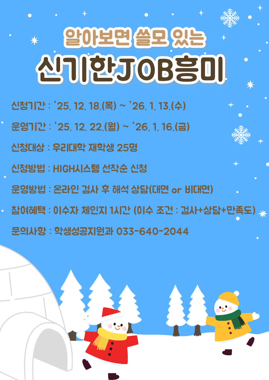 fnctId=bbs,fnctNo=1046 [학생성공지원과] 알쓸신JOB(STRONG 직업흥미검사) (12월) 작성일 2025.12.18 작성자 학생성공지원과 조회수 1053 첨부파일 첨부파일이(가) 없습니다.