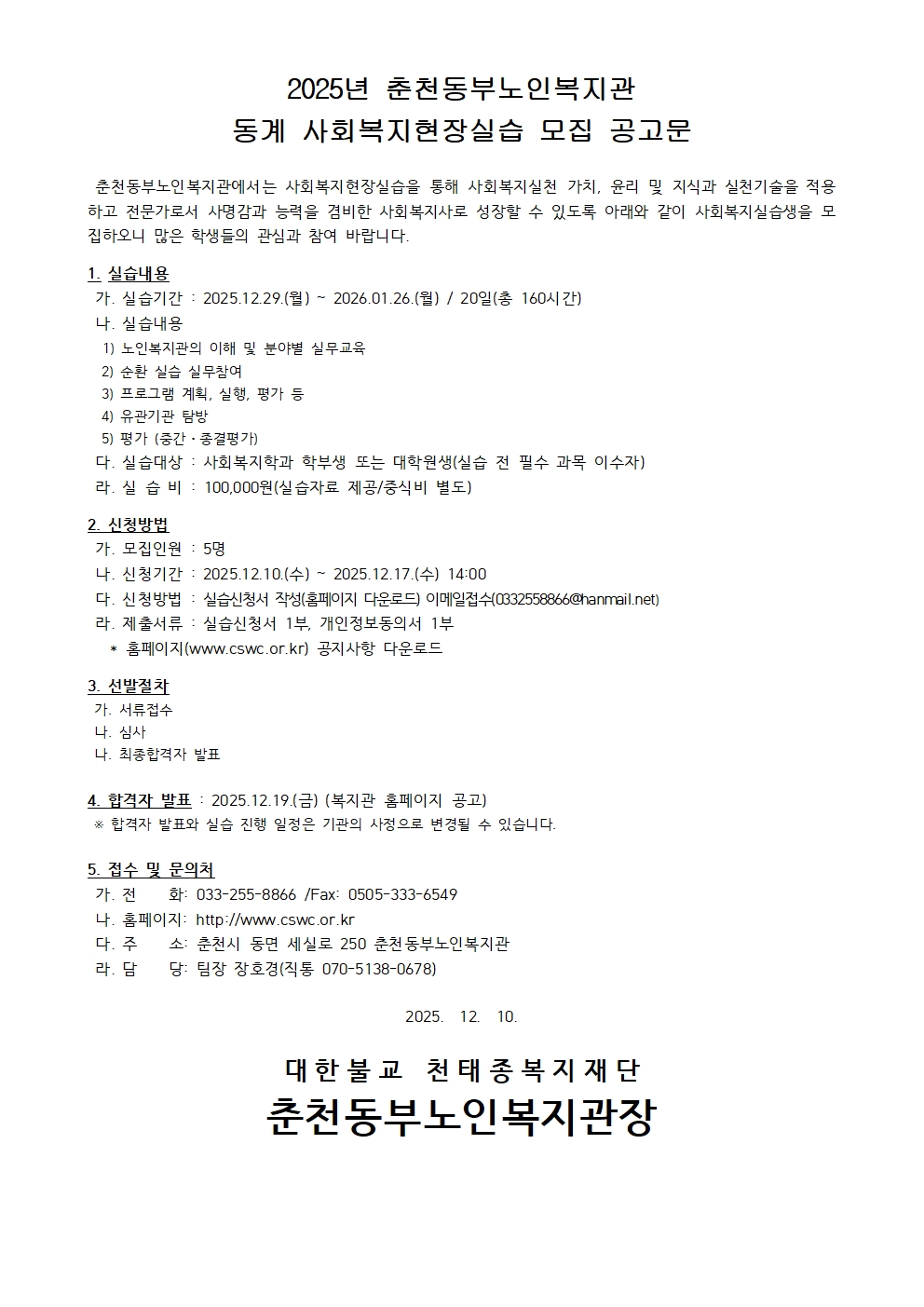 fnctId=bbs,fnctNo=849 [2026-동계] 춘천동부노인복지관 동계 실습생 모집 안내(~12.17.) 작성일 2025.12.15 작성자 박아름 조회수 942 첨부파일 붙임1) 공고문.hwp 붙임2) 신청서.hwp